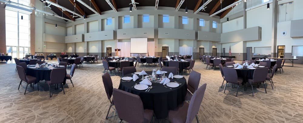 The hall is typically set up to accommodate 250 guests. You are responsible for setting up and taking down any furniture arrangements beyond the standard setup required for your event.